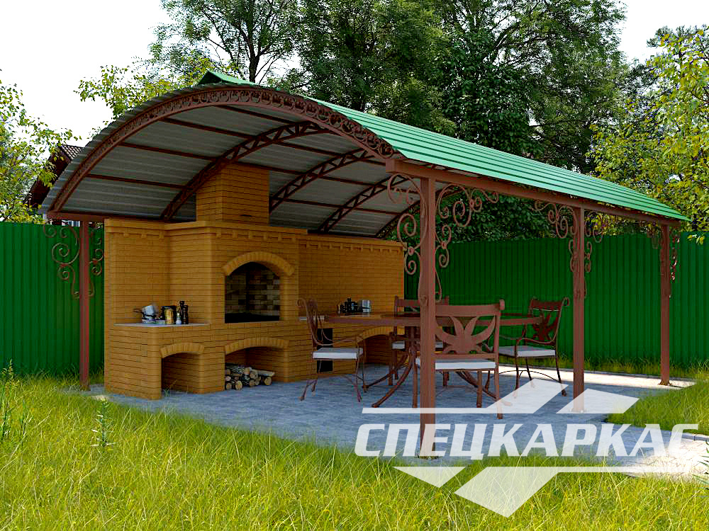 Компания «Спецкаркас» предлагает козырьки, беседки, навесы из поликарбоната любого типа и формата: одно- и двухскатные, прямые и наклонные, арочные и даже куполообразные.